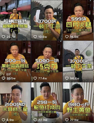 “300块一两和牛牛排”、“3700元的下午茶”、“7.5万住一晚总统套房”、“花199万元坐月子”等富人高端消费体验视频,核心卖点是“贵”,